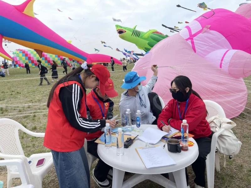 青年志愿者们身着统一服装,分工明确、各司其职,大家积极协助裁判人员开展评分记录、资料整理等工作,认真配合赛事流程,保障裁判工作高效有序进行。同时,主动为现场外国友人提供沟通协助与路线指引,细心搀扶老人、照看儿童,守护游客安全;遇到风筝缠绕、放飞不便等情况,也及时上前帮忙调整,用贴心服务为往来人员排忧解难。面对络绎不绝的游客与参赛人员,大家始终认真负责、耐心细致,主动配合工作人员完成各项保障任务,用踏实的行动为赛事有序进行提供了有力支持。