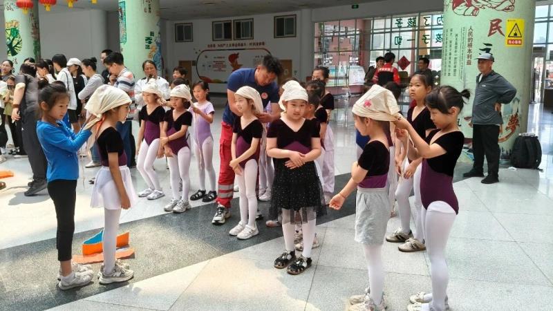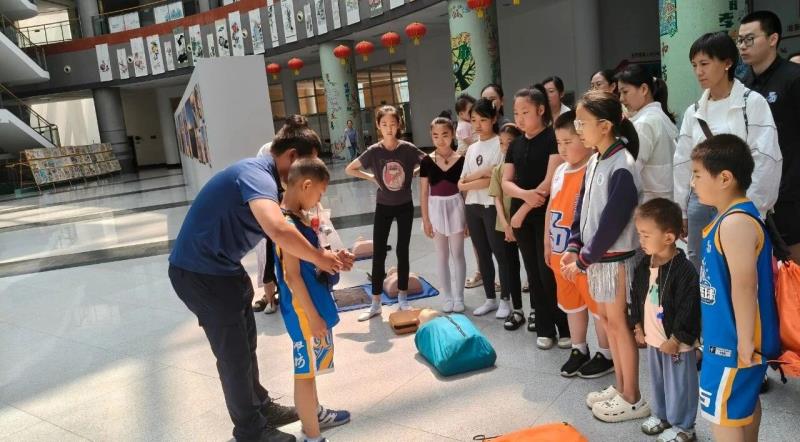 在中心场馆一楼大厅,学生们分成4个小组,在潍坊市雷霆救援队教官的指导下,现场学习火灾逃生、海姆立克急救法、防溺水知识以及创伤救护等实用技能。学生们热情高涨,认真模仿急救动作,在实践中切实掌握了应急救护的关键要点。