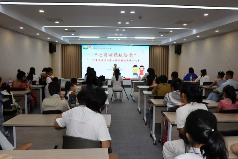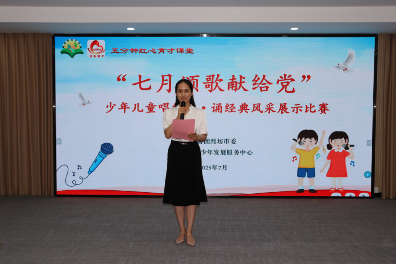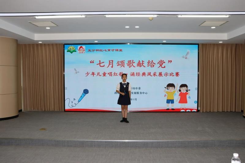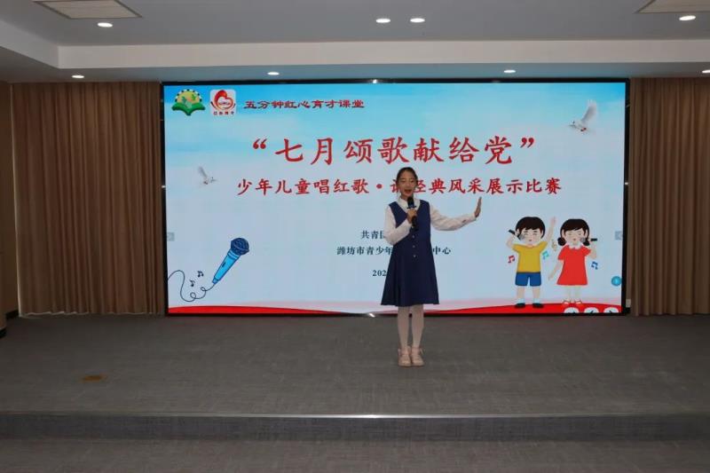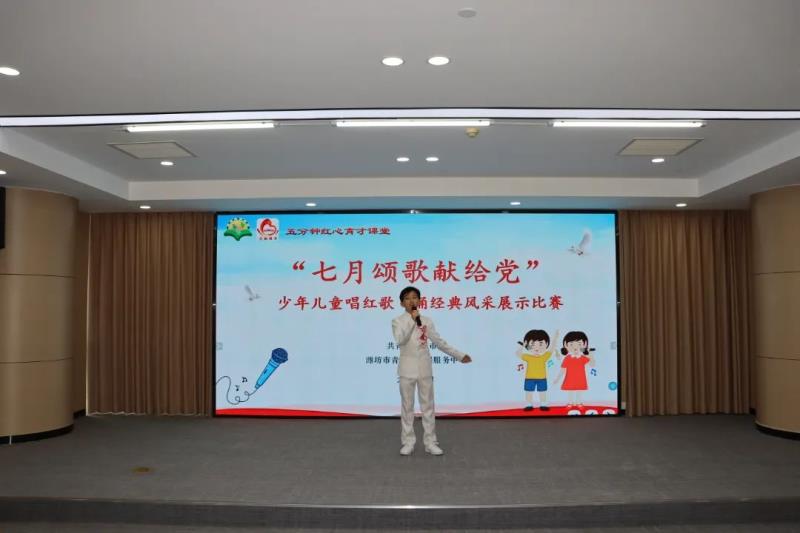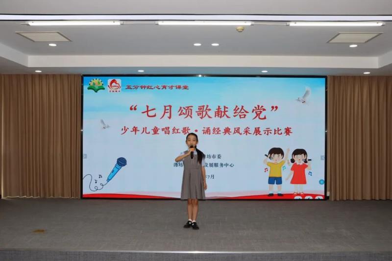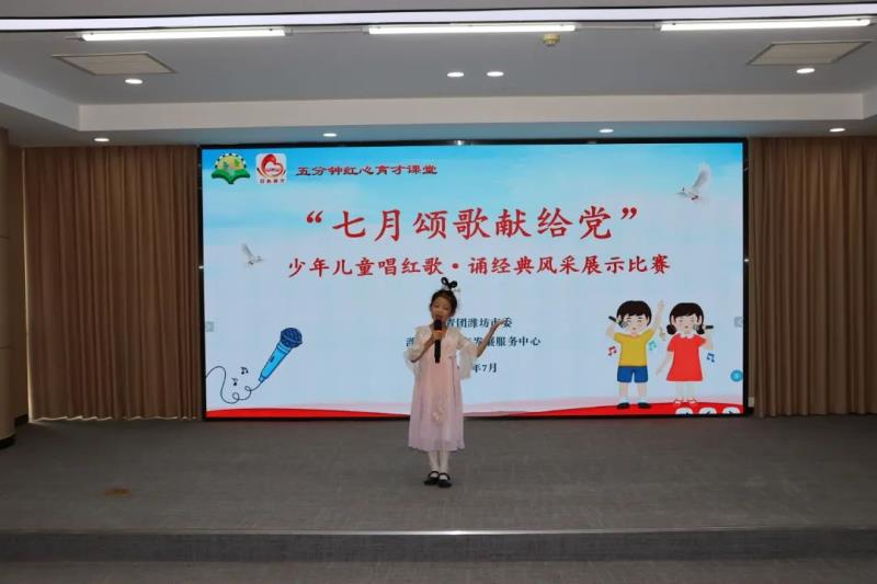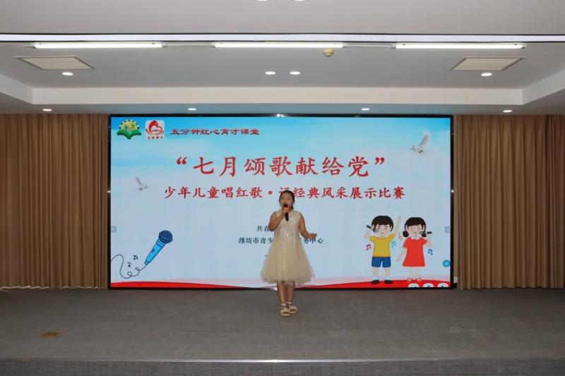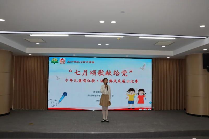 为庆祝中国共产党成立104周年,深情回顾党的光辉历程,大力弘扬红色文化精神,共青团潍坊市委、潍坊市青少年发展服务中心举行“五分钟红心育才课堂”——“七月颂歌献给党”少年儿童唱红歌·诵经典风采展示活动。一个月来,孩子们用稚嫩的声音反复打磨红色旋律、诵读经典篇章,让整个七月都浸润在对党的赤诚礼赞中。7月31日,“七月颂歌献给党”少年儿童唱红歌·诵经典风采展示比赛正式拉开帷幕。本次活动吸引了众多少年儿童参与,经过推荐选拔,72名选手参加现场风采展示比赛,比赛现场气氛热烈,充满了对党的深情祝福。